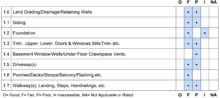Exterior inspection findings showing everything in “Fair” or “Poor” condition