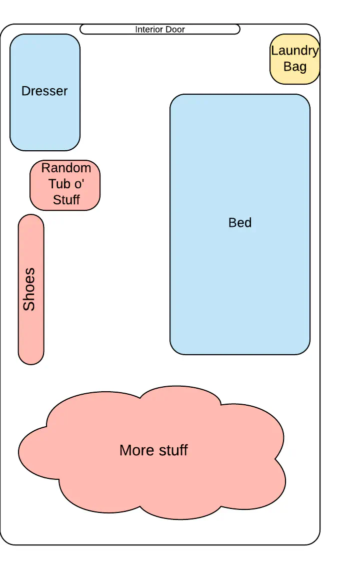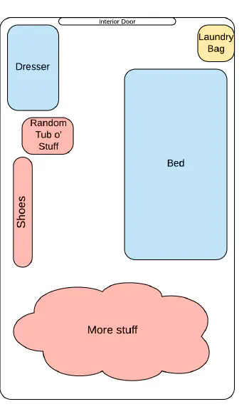 My home is roughly 16’ x 6’, or 96 ft2. That makes it a little smaller than your average bedroom. In other words, it’s in my best interest to optimize how I use my limited space. Two years ago, I talked about consolidating and defragmenting how I laid out my room. The diagram I used looked like this: