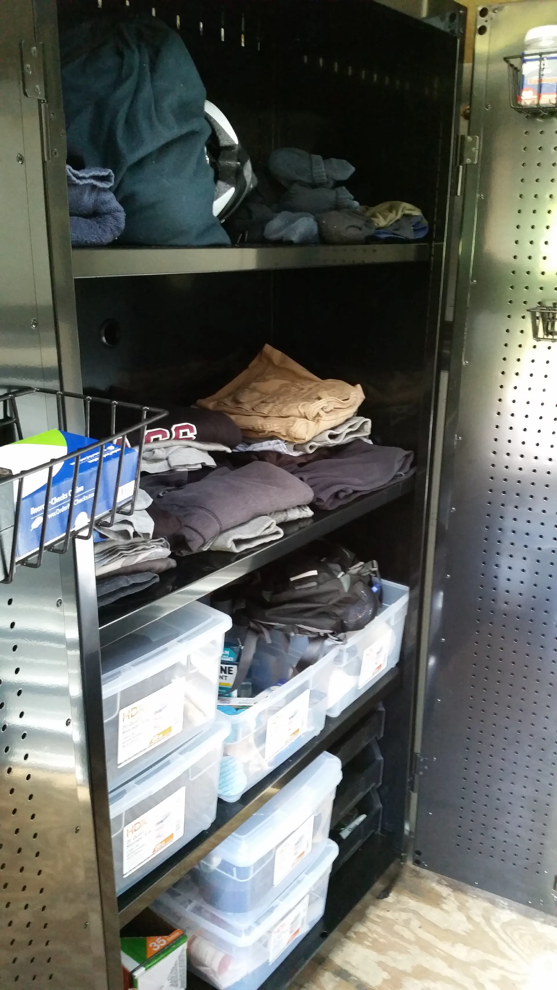 While unorthodox, this has a number of benefits over any dresser-based solution. For one, this thing is huge. Volume-wise, it’s probably twice the size of the dresser I tossed out. That means I can fit all my clothes, and any remaining Random Stuff™ worth keeping. It’s also made of steel, so it’s more sturdy and durable than any wooden furniture I could have picked up. Even though I don’t have any more water/leak problems, it’s still nice to have something a bit more resilient to such things. Best of all, this thing locks, which means the doors won’t be opening while I’m driving (provided I remember to lock it). It’s also more secure, not that I’m worried about people stealing from me.