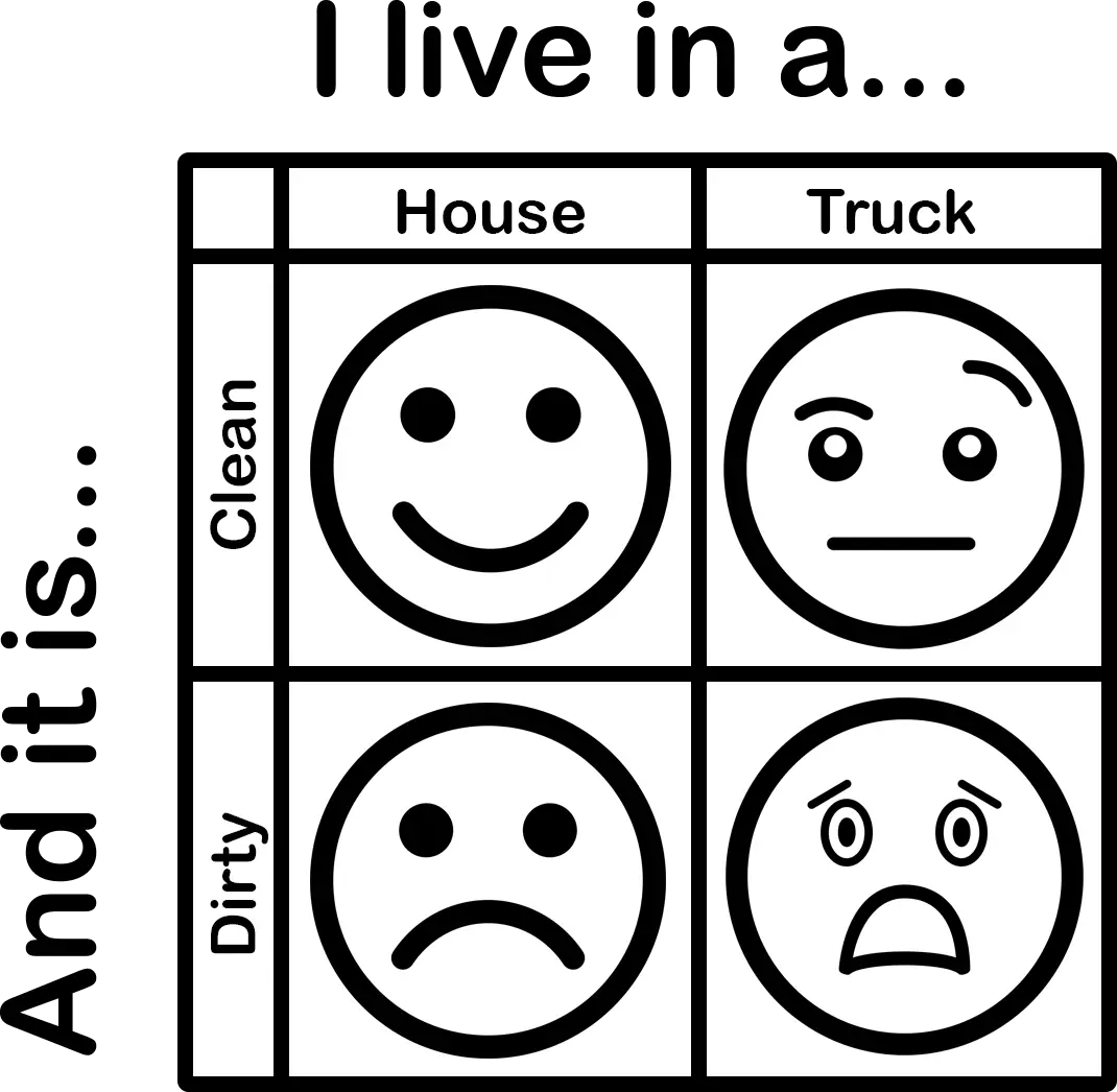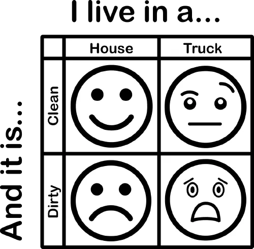 It’s also about keeping up some semblance of appearances. I’m living in a truck, I need to do something to make it look like I have my life together. It’s why I try to wear halfway decent dress shirts to work, and (attempt to) maintain this blog. I can’t live in a truck and have it look like a war zone. I made a helpful chart to illustrate my point: