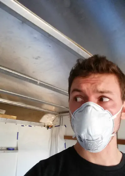 Anything more than very basic instructions leave me befuddled and deterred, so I was grateful that the fiberglass resin and hardener had simple ratios to mix together: a certain number of drops of hardener per cup of resin. The trick is that you only have 10-15 minutes of time to spread the mixture once you mix them, then they harden up and become a sad unusable cement. That’s why I had been binging on Chobanis®, I needed multiple cups for multiple small batches. So I poured a small quantity of the molasses-like resin into my plastic measuring cup, and then counted out the corresponding number of hardener drops into one of my re-purposed yogurt cups. After pouring the two components into the same container, I frantically looked around for the stirring sticks I had completely forgotten to purchase. Luckily, the wood chips on the ground just outside the truck made for great improvised stirring sticks. From there, it was just a matter of painting a thin layer of epoxy, ripping a piece of fiberglass cloth off, dabbing it all down with a little more epoxy, and then repeating the whole process again, layer after layer. I put down around 20 pieces of the fiberglass cloth in total over the course of my three batches of epoxy, with each piece roughly half the size of a sheet of paper.
