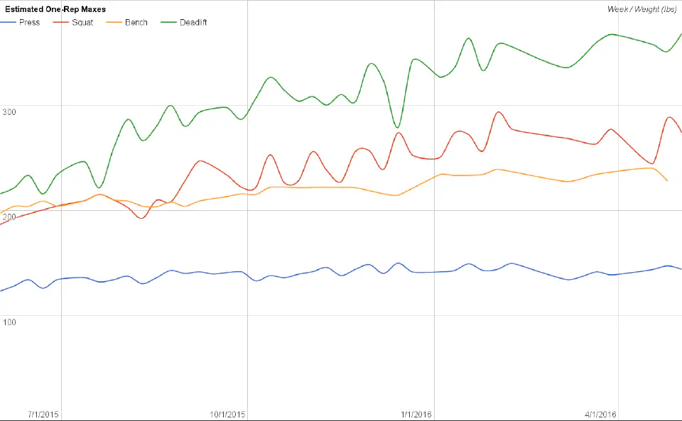…for a total of 885 pounds, pleasantly past my target. It’s a shame though, because much like our base 10 number system makes $10,000 appealing, it also makes 300 pounds appealing, which I was just shy of with my squat weight. Though at 5’ 10" and 170 pounds, I’m happy with those numbers. Happy is different than content though, and naturally, my next goal is 900, then maybe eventually 1,000 pounds. The graph at the top is promising too, with its general upward trajectory (the fluctuations are likely because of the structure of the cycles, diet, and my sometimes non-optimal sleep schedule.)