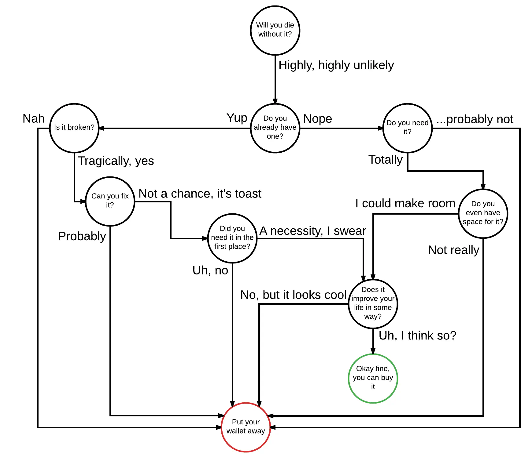 Making fun of how we do things in America just feels like low hanging fruit, or more fittingly, a cakewalk. It’s a lumbering, slow moving target, weighed down by one too many Big Macs. Plus, Wall-E already did it way better than I could anyway. So instead, I’m hoping it’ll be slightly more productive to shift the focus and talk about how I personally make my purchasing decisions. Summing it all up in a flow chart that came out more complicated and less aesthetically-pleasing than I was hoping for: