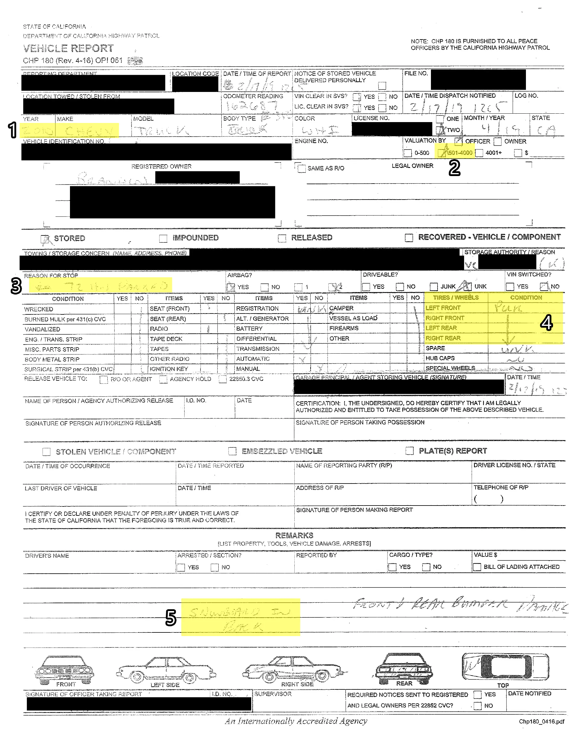 - Drive car to tow yard, ask for a copy of the police paperwork they received