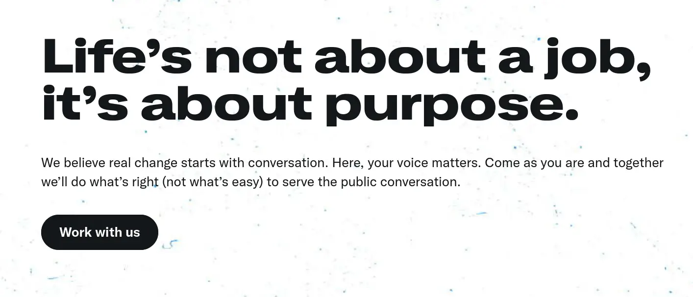 That first way of thinking (i.e. Doing Good Things at Work™) is leveraged to nauseating effect by Bay Area employers. You’d legitimately be hard-pressed to find a Silicon Valley tech job listing that doesn’t frame itself in terms of the “impact” or societal good that you’ll do working there. To give an illustrative example, I picked Twitter, pretty much at random, but you’ll have similar success by throwing darts at any ol’ tech stock index fund.