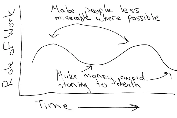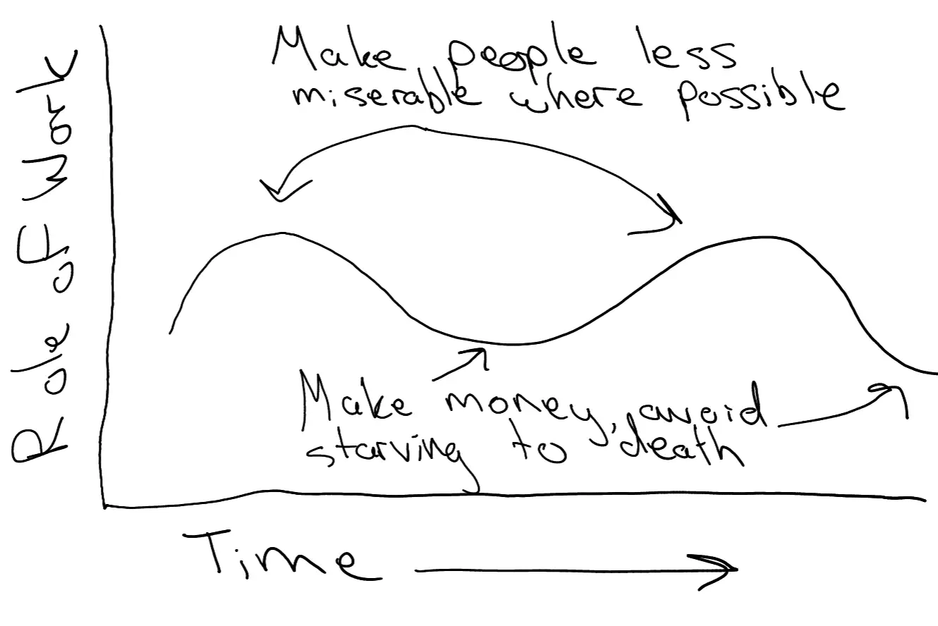 - “Work can be a force for removing misery from the world” - In this mode, I try to convince myself that the work I’m doing is not only keeping me fed, but also improves the lives of other folks in some way. I get to feel warm and fuzzy about what I spend most of my time doing, my employer implicitly gets a discount on my labor.