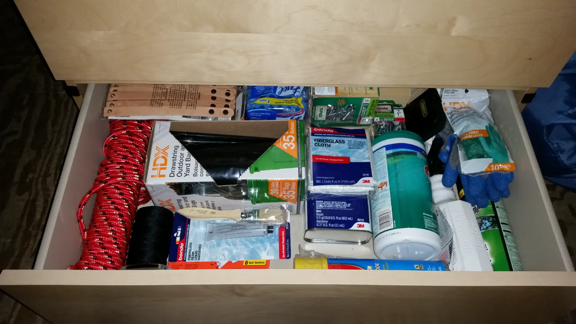 Though there is something to be said for the contents of the dresser. Clothes will also survive in the heat, but my entire bottom drawer is filled with all manner of tools, hardware, and sometimes, even a random assortment of chemicals. Here’s what the bottom drawer looked like, circa 2015: