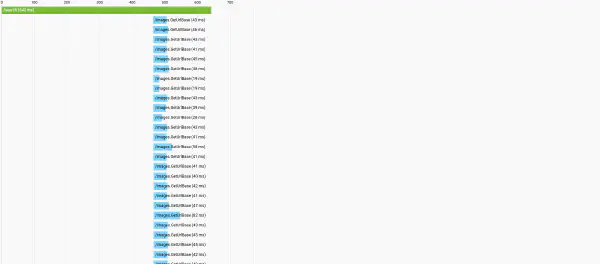 But it turns out I had an even worse offender, the search functionality (which actually works now). A search for a common word, like “the” or “truck” or “deranged” (kidding) would load the entire corpus of posts, and all of their images serially, as shown below.