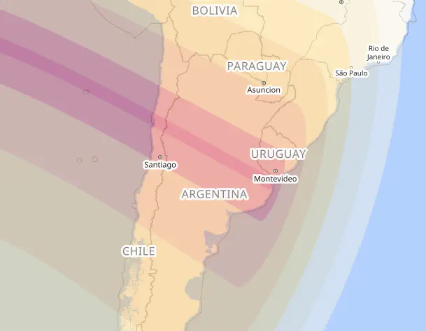 The main barrier to my newfound addiction: total solar eclipses are finicky. They don’t happen often (~less than once a year), and they happen over an effectively random stretch of the planet. Post-2017, the next one wasn’t until 2019, and it had every intention of passing over a narrow strip of South America, visible in small parts of Chile and Argentina. Even more rudely, this narrow strip (in dark red below, call the “path of totality”) had the audacity to avoid most of the major cities that would make viewing it easy.