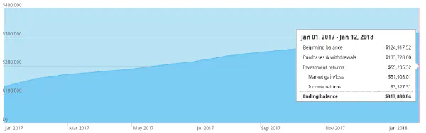 Thankfully, that’s all in the past. At the beginning of 2017, I had ~$125,000 invested. At the beginning of 2018 (i.e. two weeks ago), I had ~$314,000 invested. To clarify, this is the balance of my Vanguard accounts, so it includes my 401k, Roth IRA, and brokerage account. It doesn’t include checking accounts, my HSA, any assets (not that I have any), or the change in my cupholder.